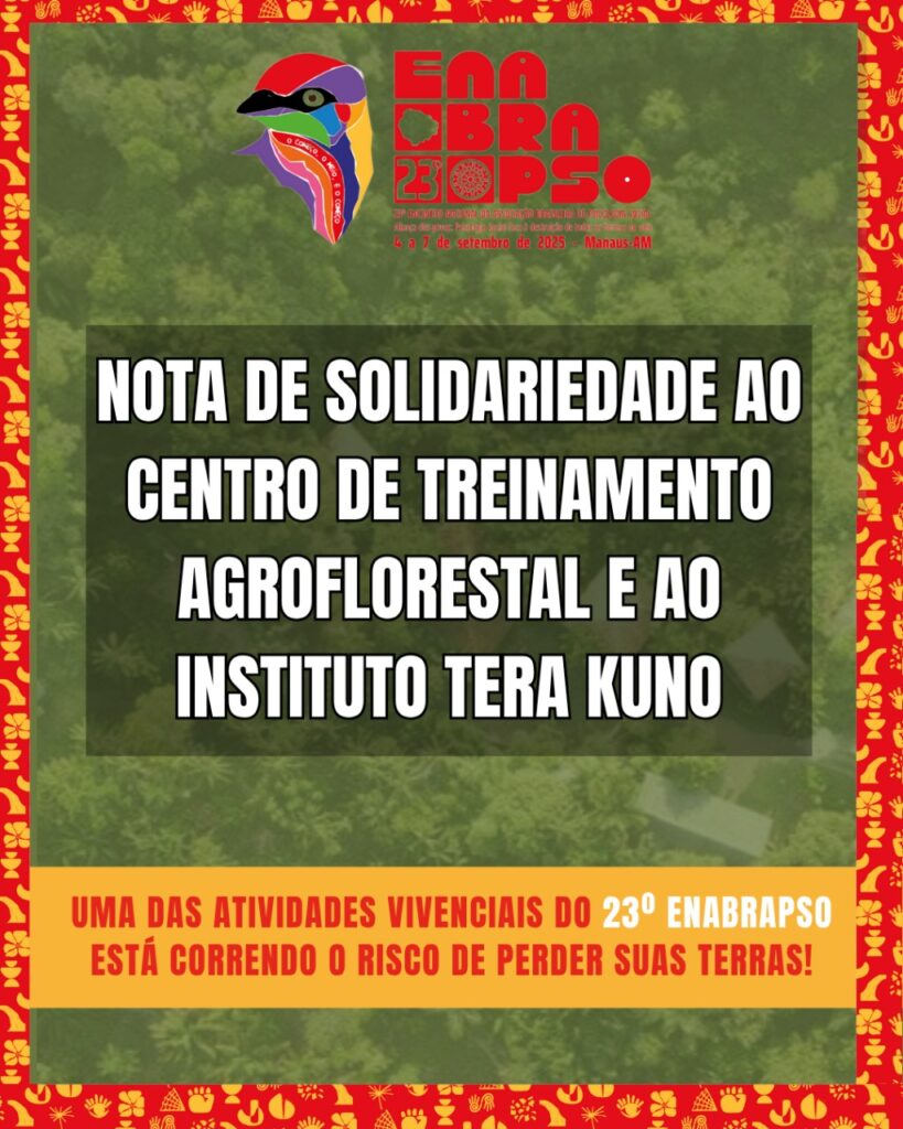 A Direção Nacional da ABRAPSO manifesta sua solidariedade ao Centro de Treinamento Agroflorestal (CTA) e ao Instituto Tera Kuno, localizado no Assentamento PA Água Branca, dentro da Área de Proteção Ambiental (APA) Adolpho Ducke, em Manaus (AM).